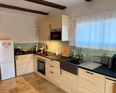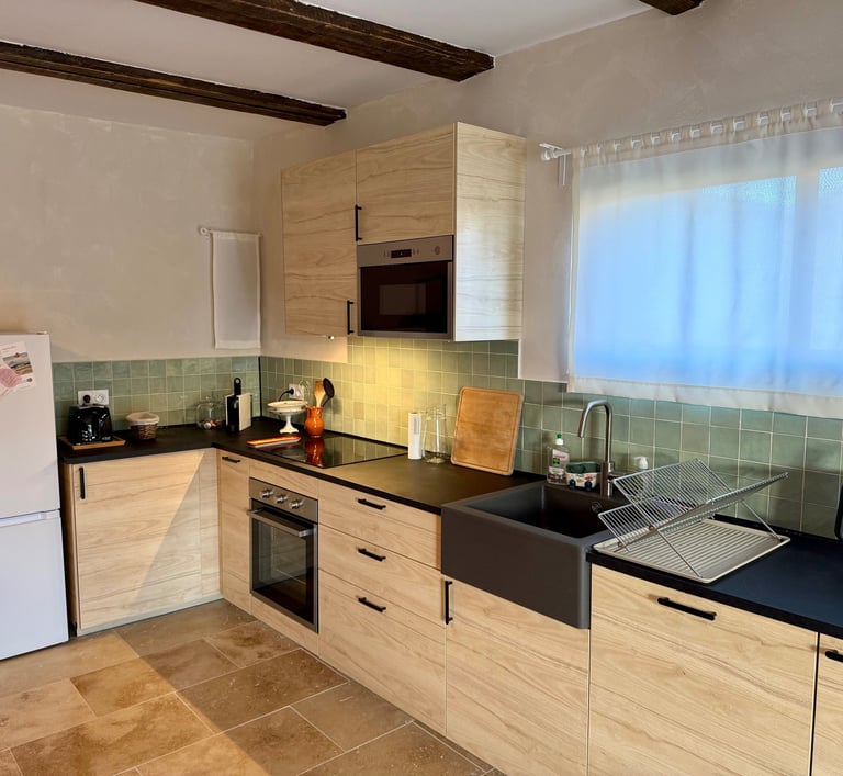 Il dispose d’une cuisine neuve toute équipée, qui vous permettra de faire de bons repas, à déguster sur la terrasse au bord de la piscine.